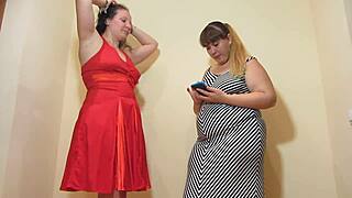 two fat ass mature lesbians stuff panties deep in hairy pussies using phones close up