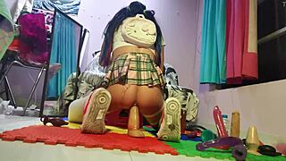 Hot cosplay doll drills herself solo with purple toy action