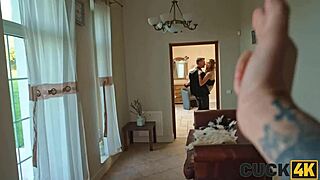 Beautiful shaved wife with natural tits gets fucked by monster cock in Cuck4k hotwife debacle.