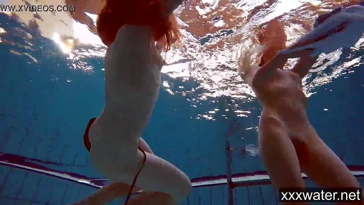 Russian girls in bikinis swimming and playing underwater in the pool